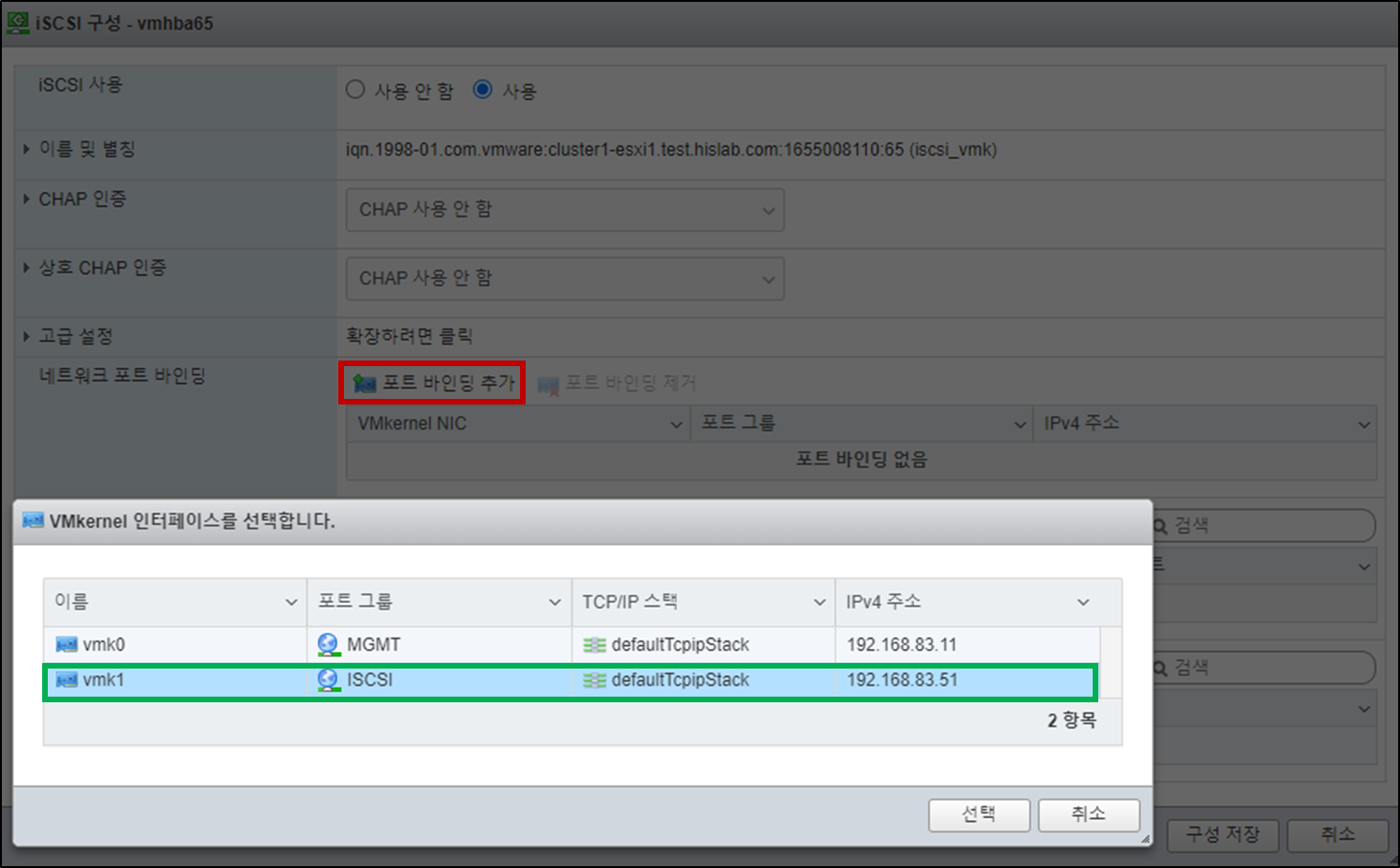 위에서 생성한 ISCSI 전용 VMKernel NIC를 지정해줌.