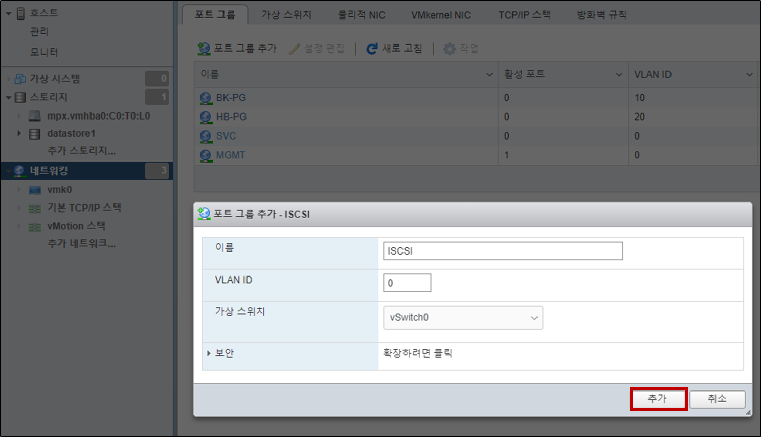 기존 포트그룹과 분리해서 관리하기 위해, ISCSI 포트 그룹 생성.
