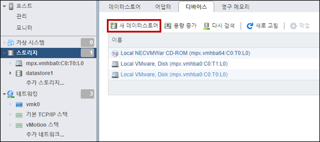 ESXi → 스토리지 → 디바이스 탭 → 새 데이터스토어